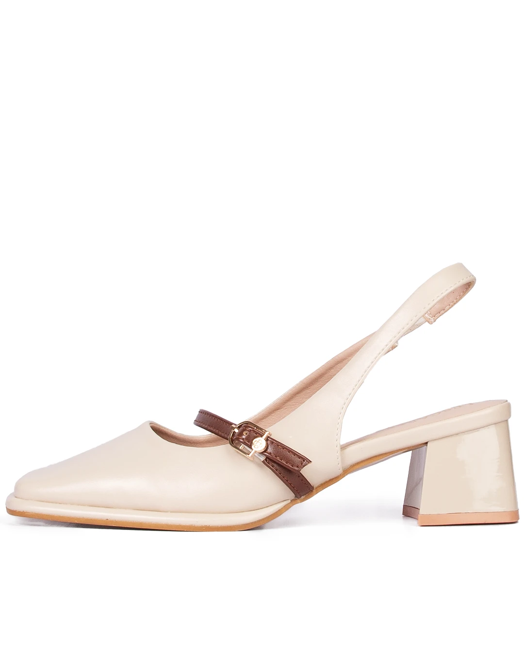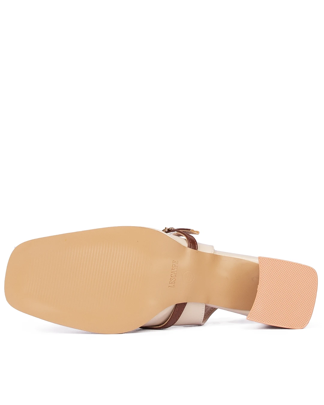 لوفر زنانه کرم روشن، پشتباز با پاشنه ۳ سانتی و بند قهوهای؛ ترکیبی از راحتی و استایل شیک.