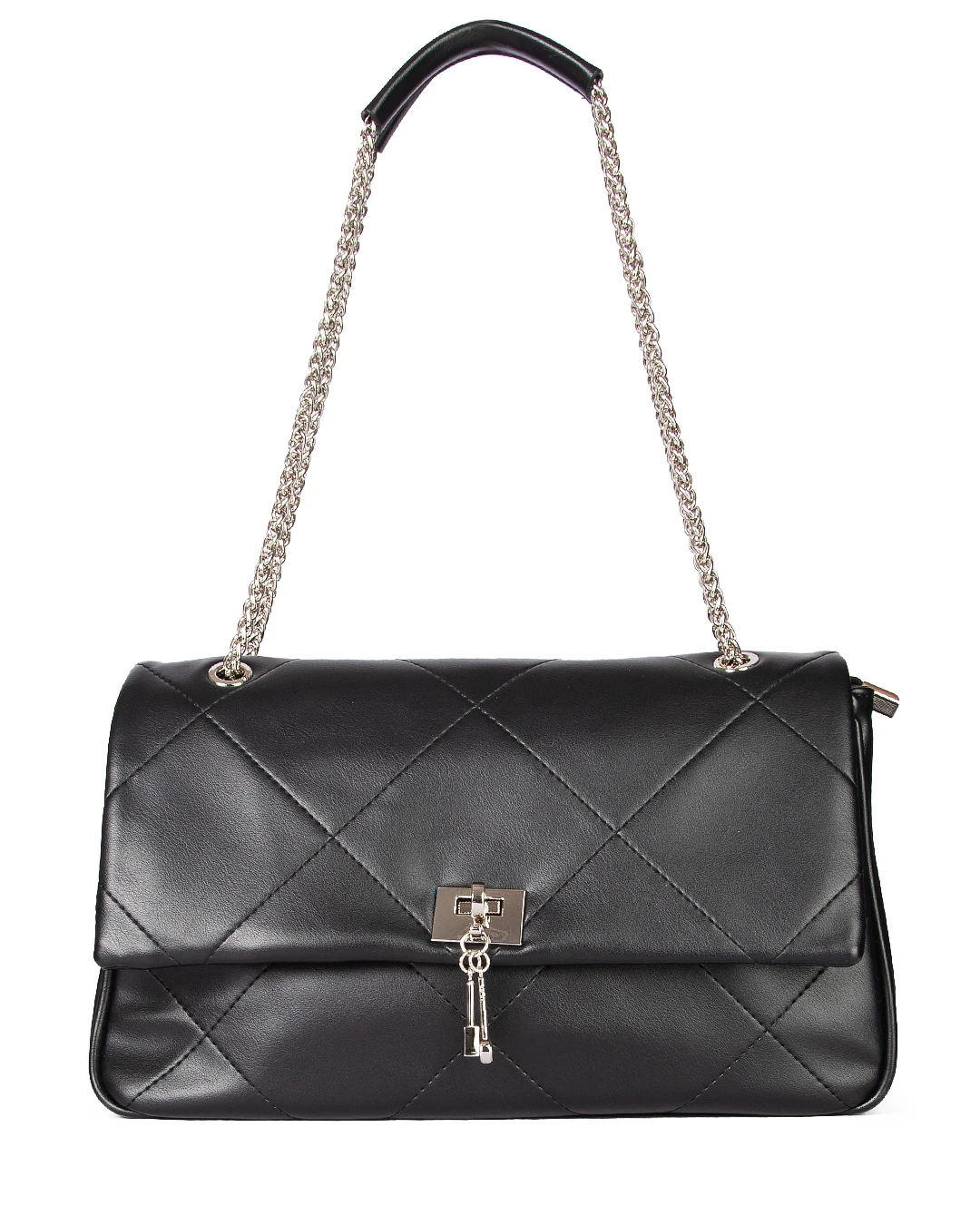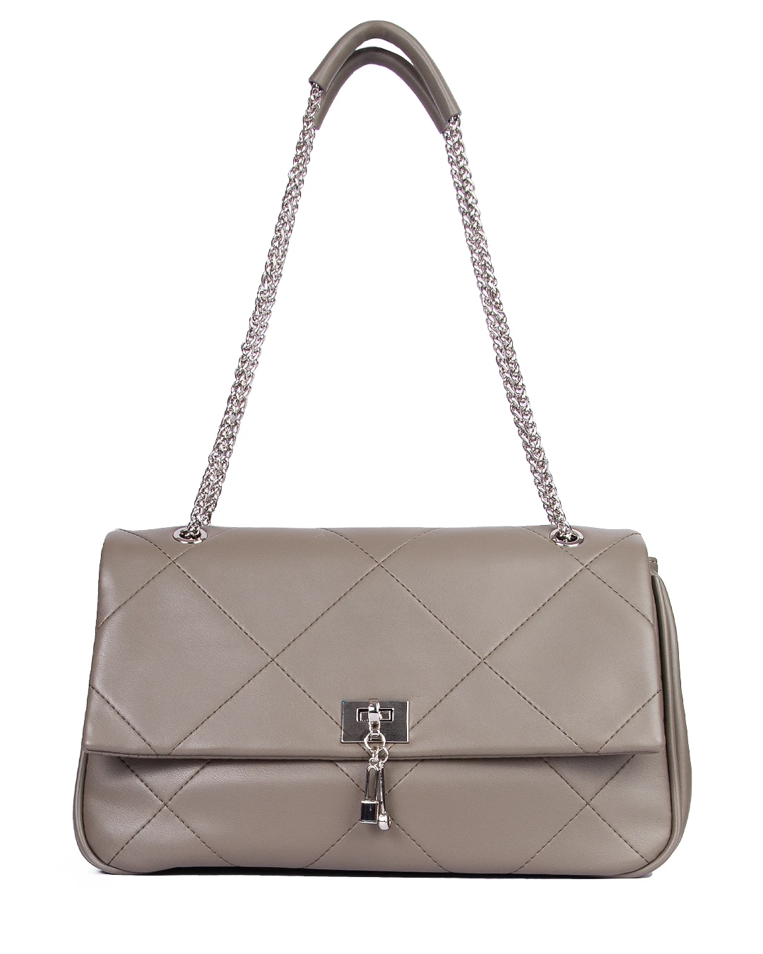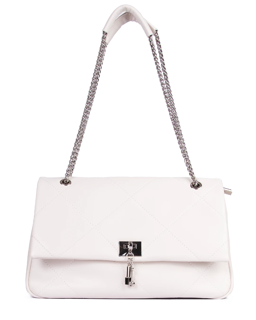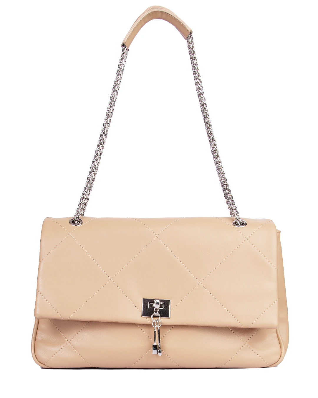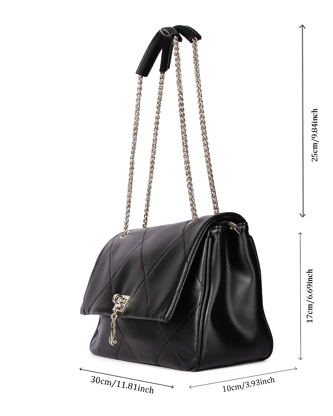 با دوخت لوزی روی چرم، بند ترکیبی زنجیر و چرم، و قفل آویز زیبا. طراحی خاص و مدرن، مناسب استایل روزمره و مجلسی. در ۴ رنگ متنوع.